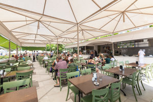Der var shuttelbus til stranden, hvor der var fine muligheder for liggestole og forplejning.